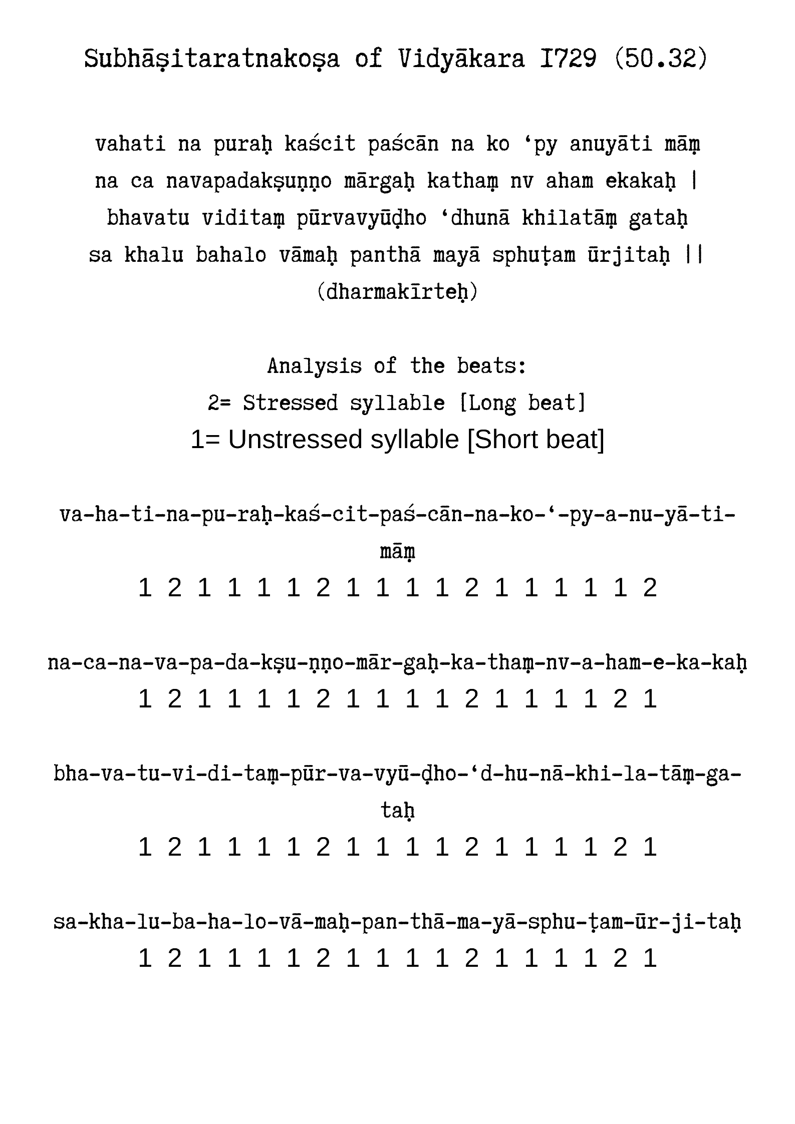 In Sanskrit poetry, stressed syllables are called long syllables, and unstressed syllables are called short syllables. A long syllable in Sanskrit is twice as long as a short syllable when you pronounce it. That is, when you read Sanskrit poetry, a long syllable lasts two beats of time, and a short syllable lasts one beat of time. Take the example of the Sanskrit word tattva. It is split as tat (long)-tva(short). If we distinctly enunciate each syllable, the first syllable's heaviness is unavoidable and lasts two beats of time.
